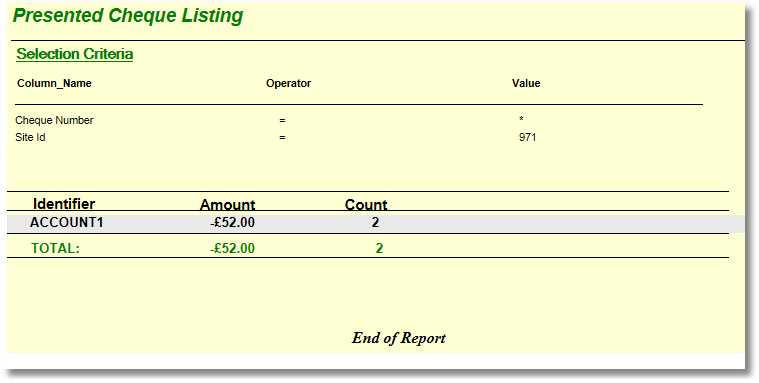 This report shows cheques that have been issued to customers, which have not yet been matched against presented cheques from the bank statement.